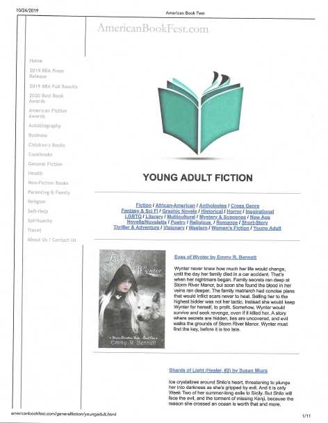 I’m so excited to share with you –Eyes of Wynter has been picked to be featured on American Book Fest 2019 for 5 months, among other talented authors. American Book Fest 2019 Young Adult Fiction